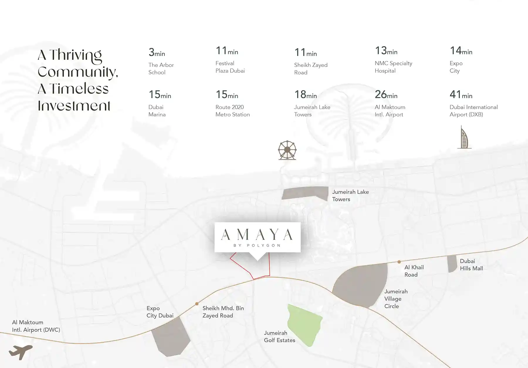 Amaya Residences is ideally located in the well-connected community of Al Furjan in Jebel Ali Village, Dubai. The development offers easy access to major highways including Sheikh Mohammed Bin Zayed Road, Sheikh Zayed Road, and Yalayis Street, along with nearby metro connectivity. Residents are just minutes away from key destinations such as Ibn Battuta Mall, Dubai Marina, JBR Beach, Palm Jumeirah, and Dubai Sports City, making it a highly convenient and desirable location.