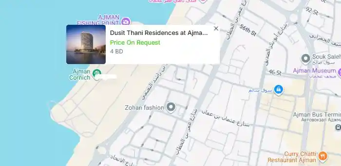 Dusit Thani Residences occupies a prime stretch of Ajman Corniche, one of the emirate’s most active residential and leisure districts. Residents benefit from beachfront access, dining venues, cafés, and scenic walking paths that define a lively coastal lifestyle.
