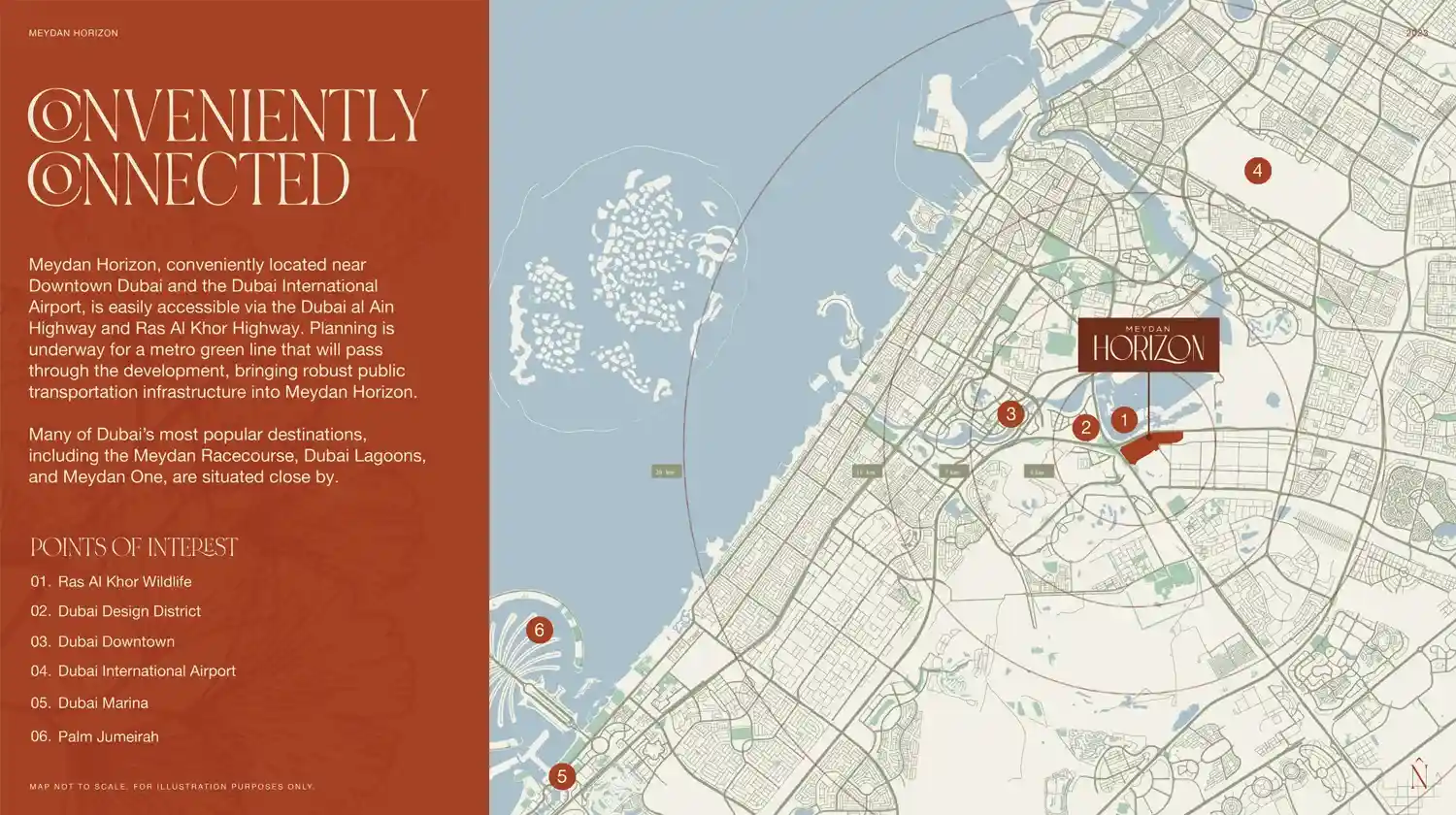 The Horizon at Meydan enjoys a prime position in Nad Al Sheba 1, Dubai, near Ras Al Khor Wildlife Sanctuary. Perfectly situated at the intersection of Ras Al Khor and Al Ain Roads, residents enjoy smooth access to Downtown Dubai, Business Bay, and Dubai Marina. The development’s strategic location enhances its appeal for both living and investment, connecting seamlessly to Dubai International Airport, DIFC, and Palm Jumeirah.