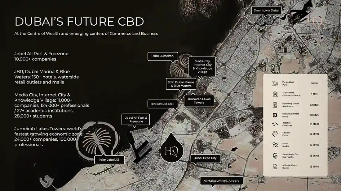 HQA at Al Furjan is a boutique commercial destination developed by Arista Properties. Strategically positioned between Dubai Marina and Jebel Ali, the project benefits from direct highway access, metro connectivity, and proximity to emerging business hubs. Designed for leaders, founders, and visionary investors, it offers just 42 exclusive offices and retail units, creating a focused environment where productivity, wellness, and sustainability take priority over excess.