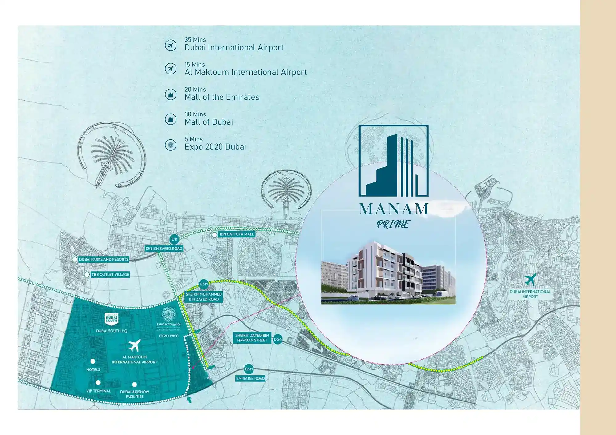 The master plan of Manam Prime is thoughtfully designed to promote a harmonious lifestyle. Residents benefit from jogging and cycling tracks, BBQ areas, landscaped gardens, wellness zones, and dancing fountains. With retail shops, healthcare services, and leisure facilities nearby, the community balances convenience, connectivity, and sustainable living, making Dubai South a growing lifestyle hub.