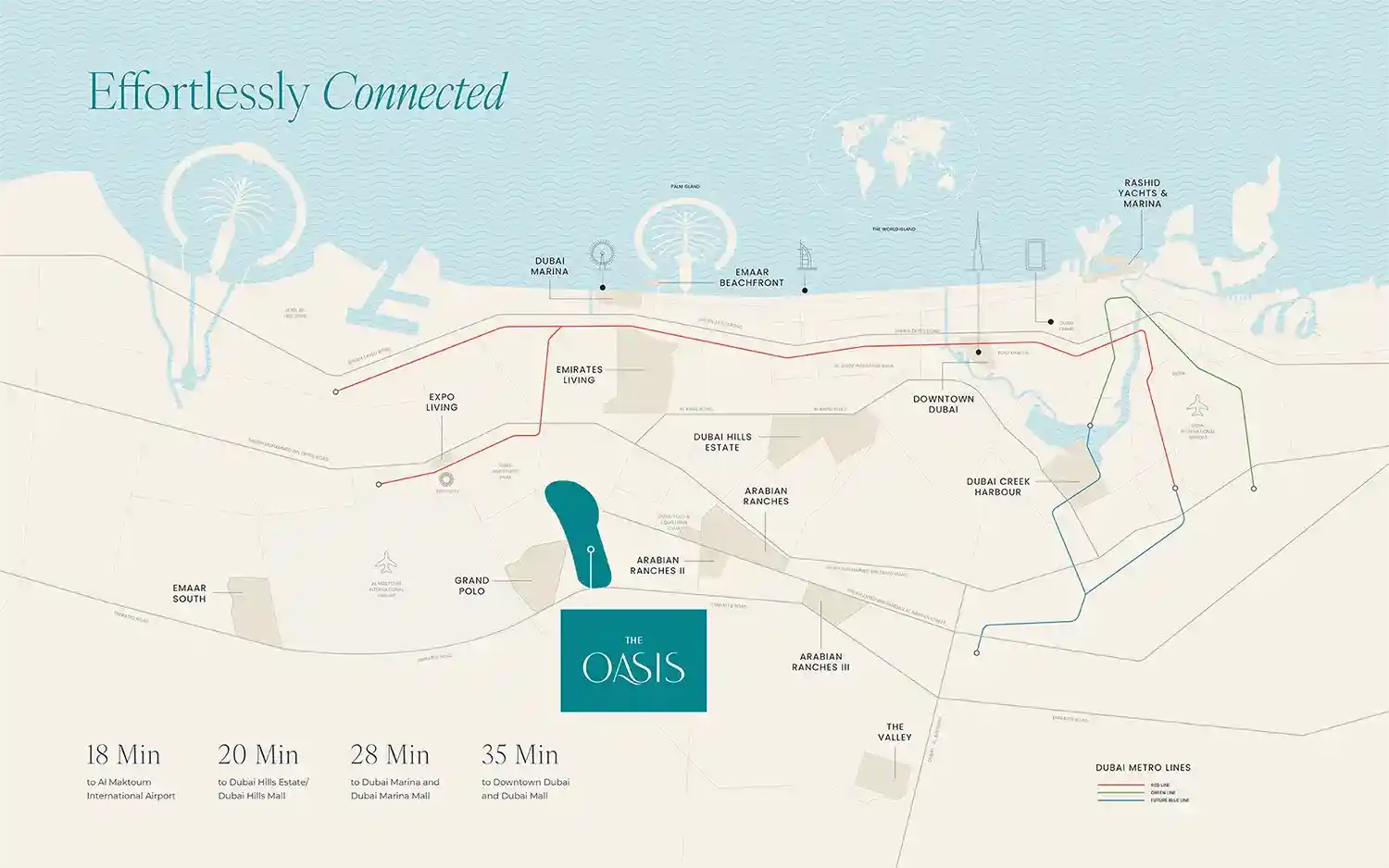 Mareva at The Oasis is nestled within a refined private community in Dubai, known for its expansive lagoon-themed waterfront charm. Positioned in a rapidly developing district, the community ensures smooth connectivity to key landmarks and major road networks. Residents enjoy uninterrupted access to lush greenery, serene waters, and a cohesive infrastructure that perfectly blends nature’s tranquility with the conveniences of modern urban living.