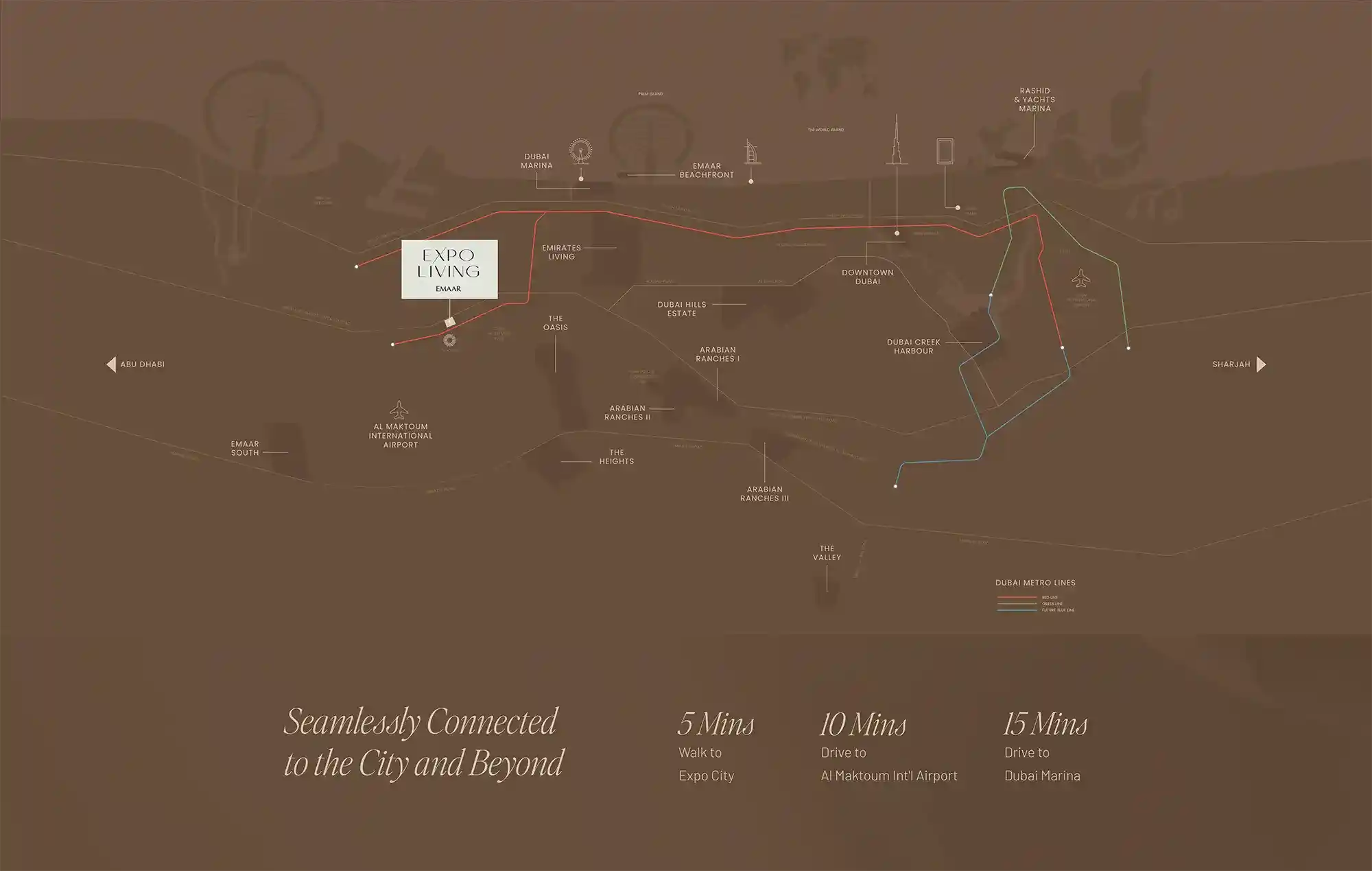 Terra Gardens by Emaar at Expo Living enjoys a prime location that connects residents to some of Dubai’s most popular destinations. With easy routes to Expo City, Dubai Marina, and Al Maktoum International Airport, daily travel becomes smooth and convenient. The community offers modern apartments and townhouses for sale, designed for those who value comfort and accessibility. Surrounded by green spaces and family-friendly facilities, Terra Gardens creates a peaceful lifestyle in a well-connected part of Dubai.