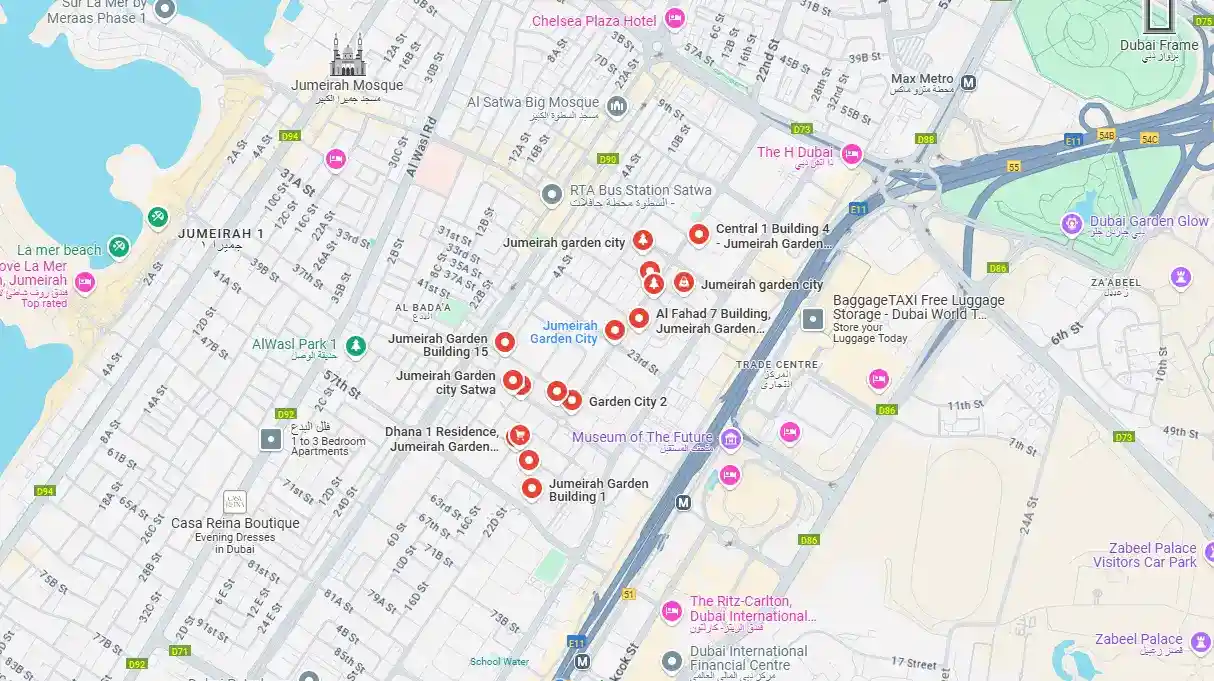 The facade features glass and marble elements, blending modernity with minimalism. Each unit has spacious layouts, open-plan living and bedrooms, abundant natural light from large windows, and private balconies offering sweeping views of Dubai’s vibrant cityscape. The location provides proximity to the coast, Sheikh Zayed Road, and key cultural landmarks including Dubai Glow Garden, Dubai Frame, Jumeirah Mosque, Mercato, and Jumeirah Beach.